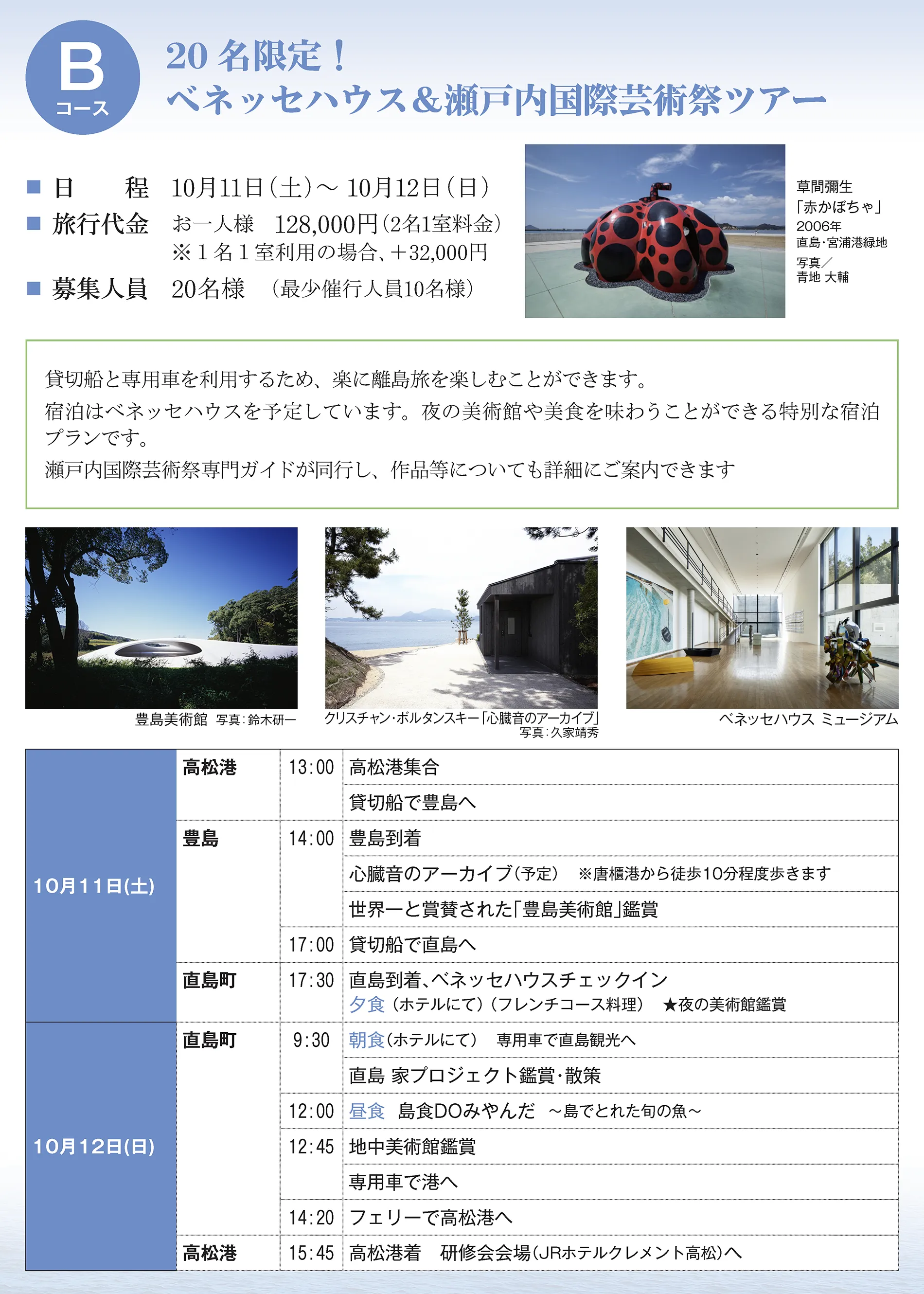 行程に記載のバス代、宿泊費(2名1室利用)、食事代(Eコース除く)、入場・拝観料等(Eコース除く)、および 消費税等諸税 - ツアー内容は現在の予定です。